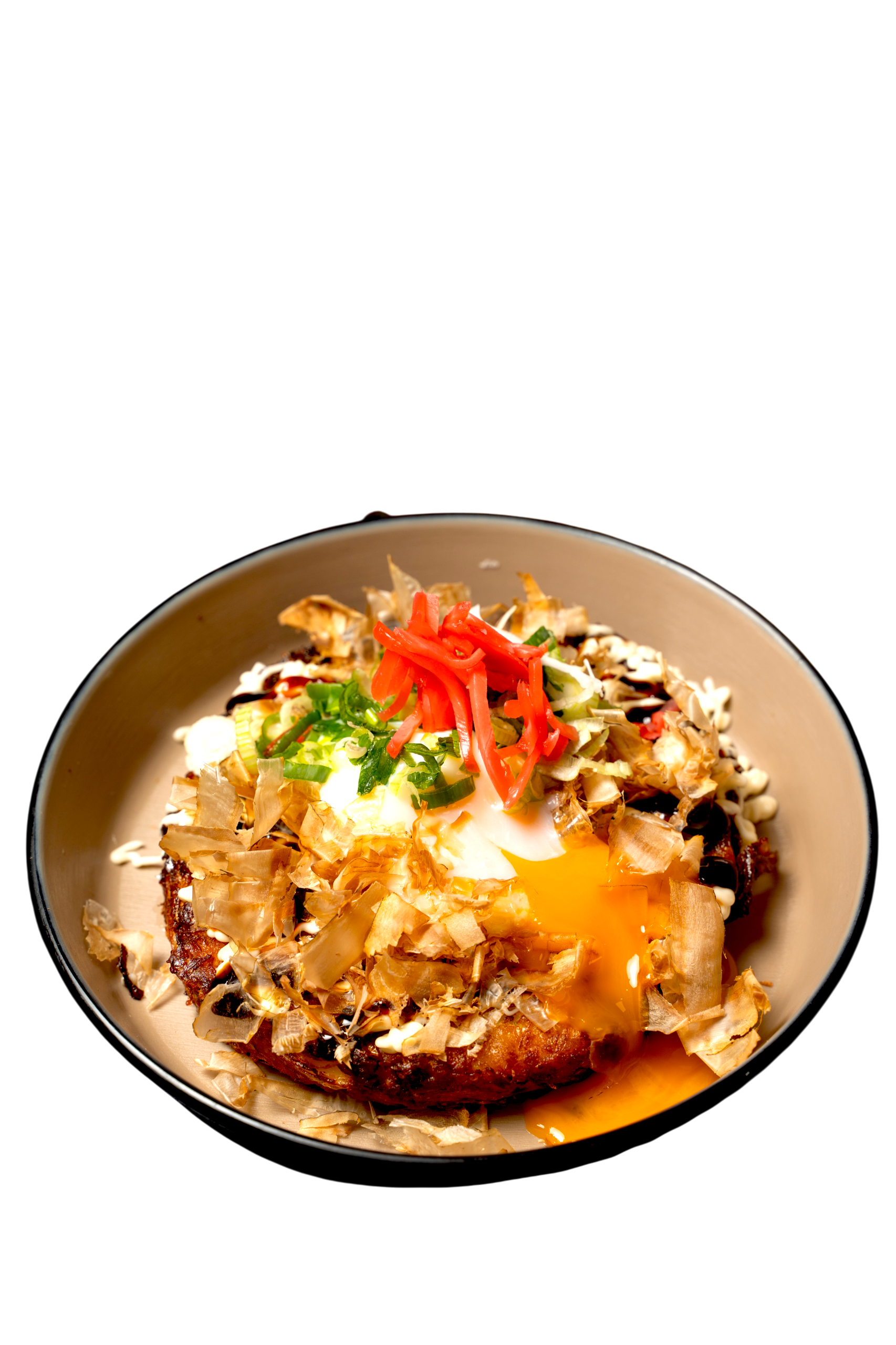 Japanese vege pancake, dry fish flake with soft boiled egg on top